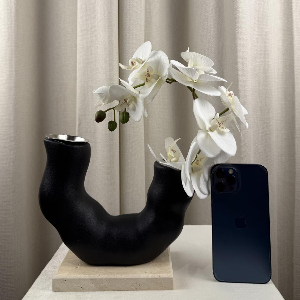 قاعدة من رخام الترفنتينو تحتوي على فازة اوركيد انيقة مع مبخر بتصميم ملفت